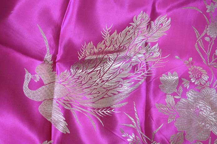 此图未处理过.但丝绸的东西周围如果有物体反射的光线不一样,颜色也会变.请一定参考 紫铜,大凤凰牡丹图细节.还有这个被面比较难织,他是先染好丝线,再织,而不是织好了.再把颜色印上,